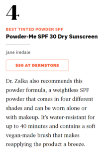 Hadley King, MD, a board-certified dermatologist in NYC, also explains that powder sunscreens have no greasy textures and don’t leave any white cast behind. “They can be worn over makeup without messing it up, and they’re also great for the part line in the scalp,” she says. Dr. King adds that the mineral sunscreens also absorb excess oil, so they can serve a dual purpose as a finishing powder that can extend the life of your makeup with added sun protection.